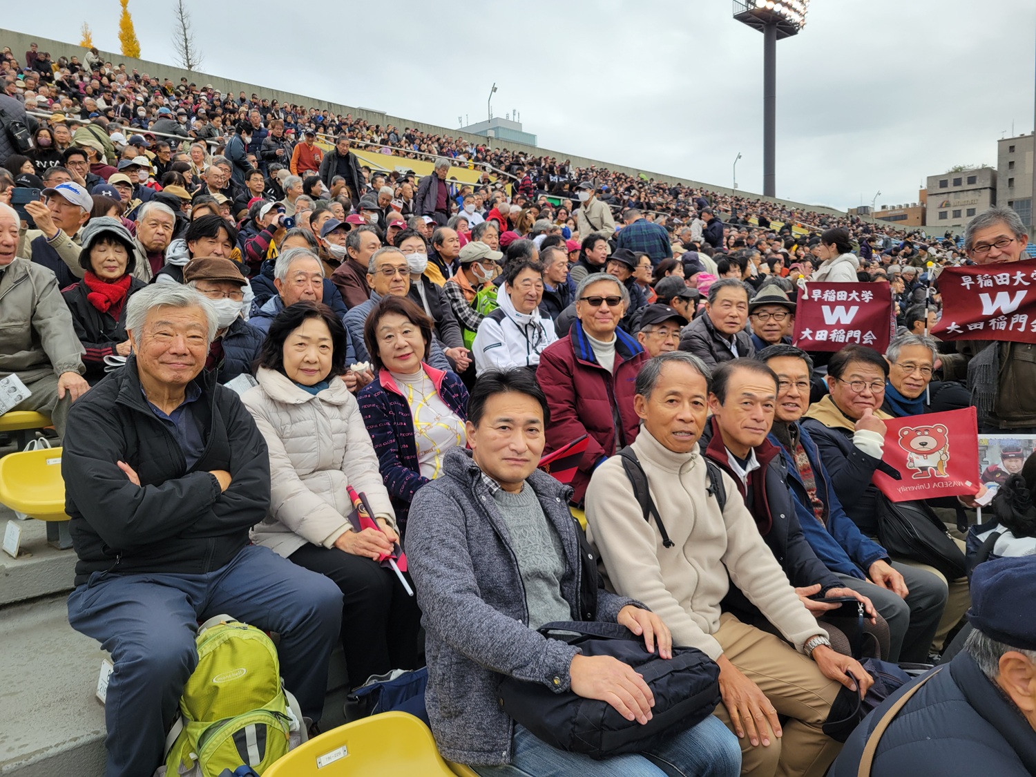 スポーツ応援部会で毎年慣例となっている「ラグビー早慶戦」を11月23日に観戦してきました。秩父宮ラグビー場バックスタンド正面席を事前に確保し25名の参加となりました。気温も高く無風のラグビー日和でした。