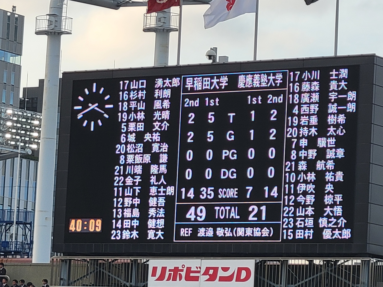 前半は序盤から早稲田のトライの連続が続き、後半は途中ミスがあったものの巻き返して、最終試合結果は49対21の大差で102回目の伝統の早慶戦を勝利しました。