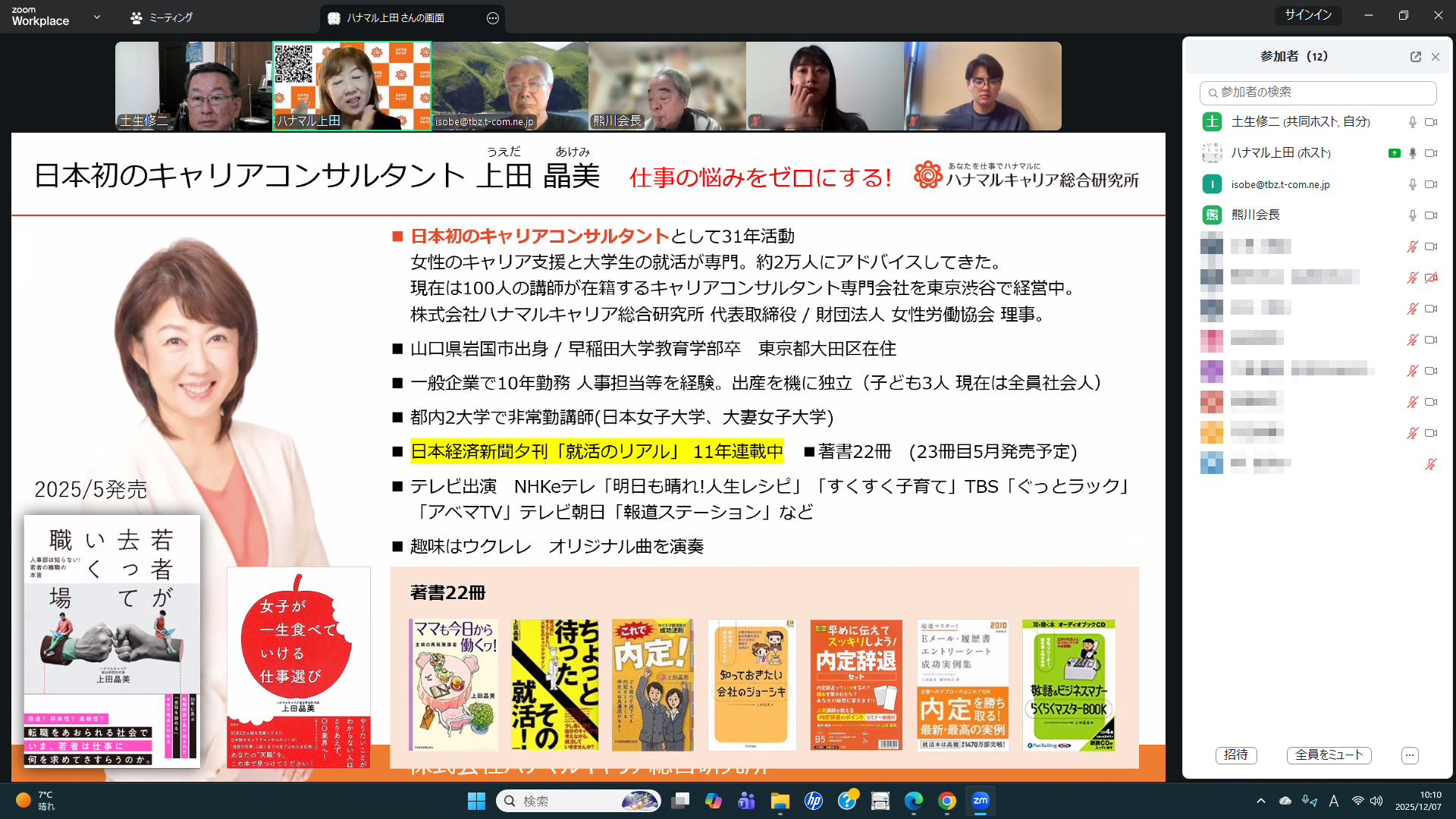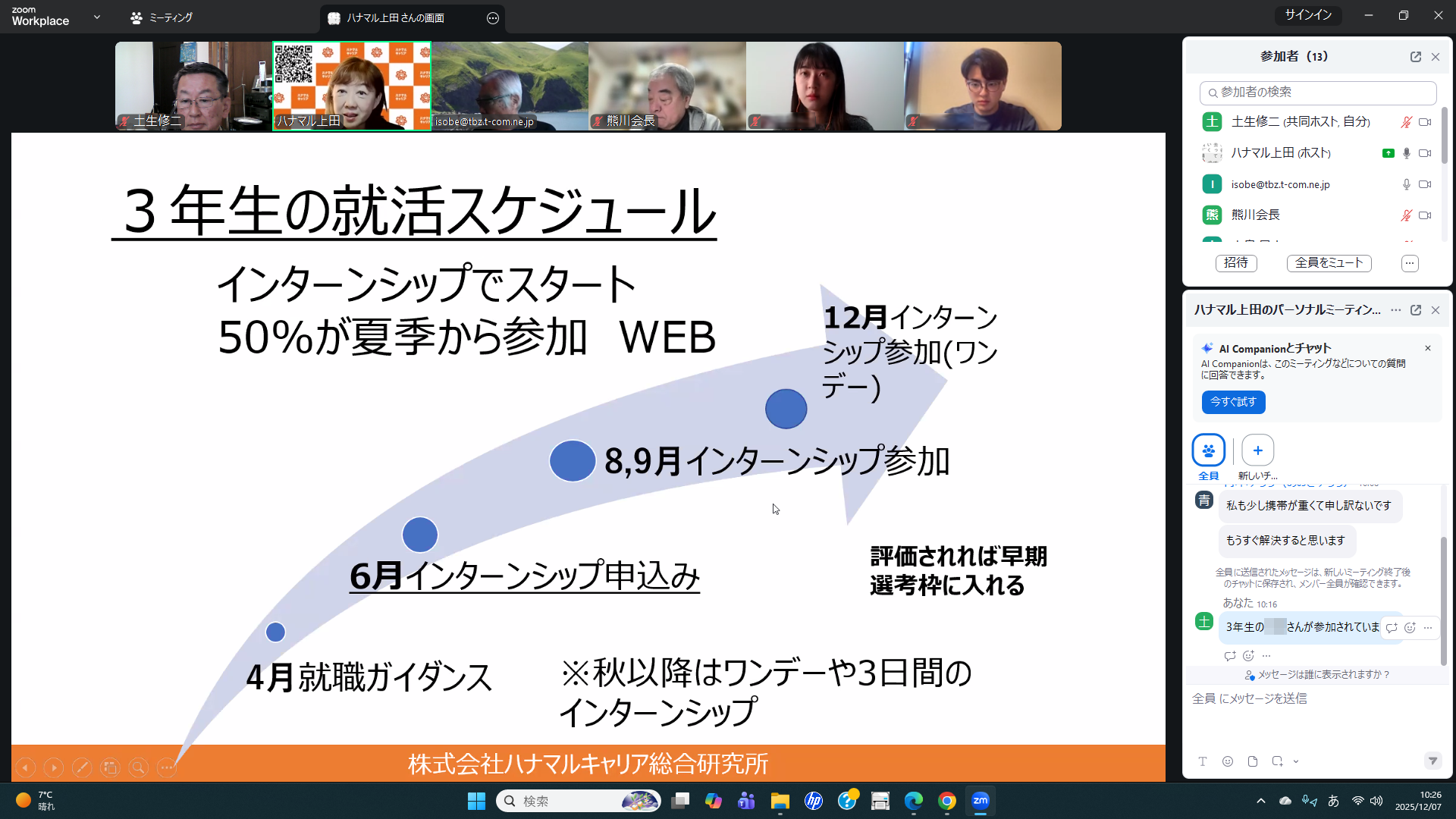参加は、学生:7名(1年生3名、2年生2名、3年生2名)、当日欠席3名、先輩のOB・OG:2名、講師:の上田晶美(1983教育卒、キャリアコンサルタント・ハナマルキャリア代表、当会会員)と当会役員:3名の合計13名と例年になく多数の参加となった。