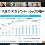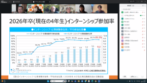 講師から「2026年就活の実態、志望業界の考え方、インターンシップ先の選び方等について」プレゼンテーションを行い、続いて先輩2名が「自身の就活、その後のキャリア形成、志望業界の考え方など」経験談を語った。