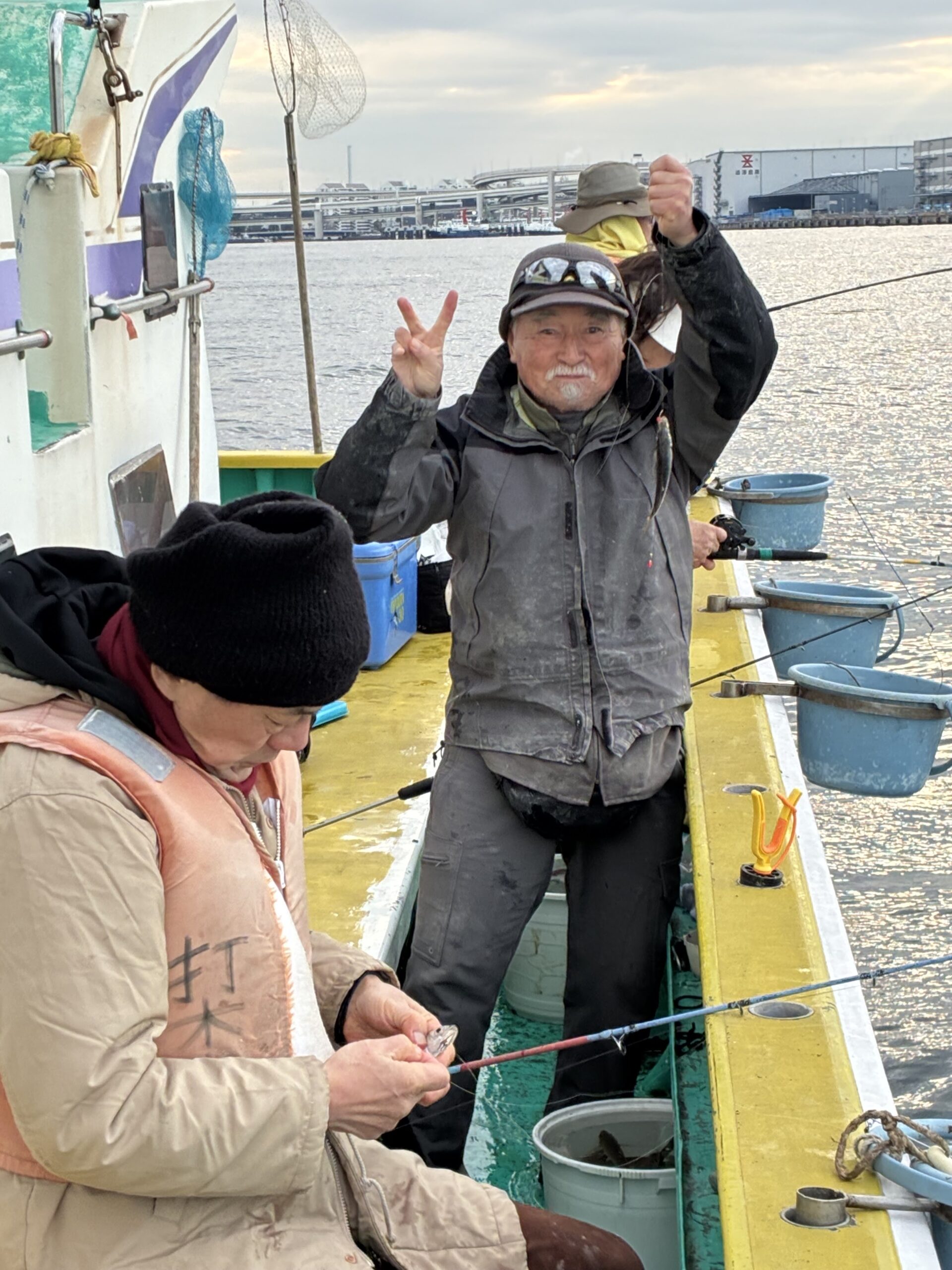 12月27日、本年最後を締めくくる魚福釣行が横浜で行われました。この日の気温は低いものの風は穏やか、海上の波も静かでそれほどの寒さを感じないなか、精鋭8名、今回の釣り場は横浜本牧、ベイブリッジを背景に海釣りを楽しみました。