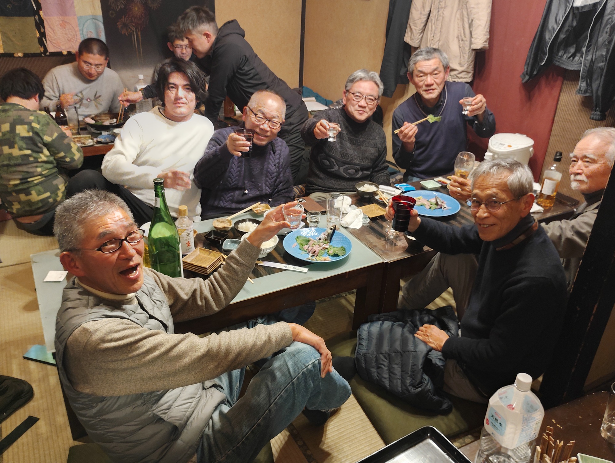 その後は近くの居酒屋「本牧漁亭」に魚を持ち込み、鯵料理に舌鼓を打ちました。同じ店に太刀魚を釣った別のグループがいて、こちらの持つ鯵と向こうの持つ太刀魚の物々交換が成立、唐揚げにした鯵と刺身にした太刀魚を分け合うという一コマも。