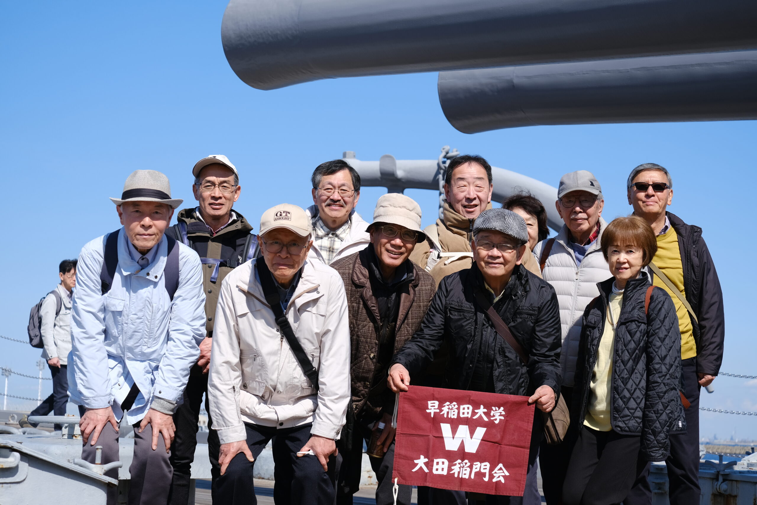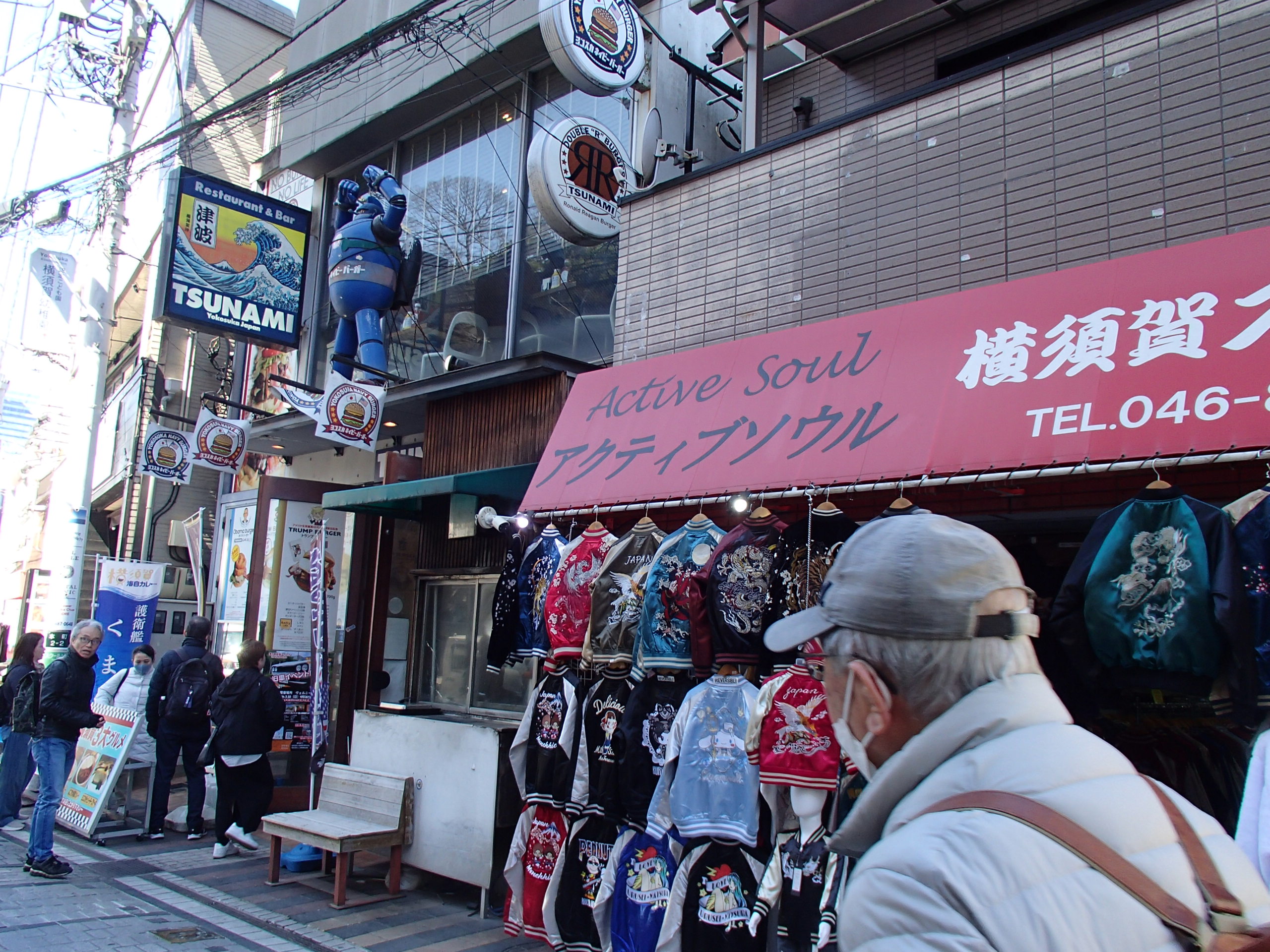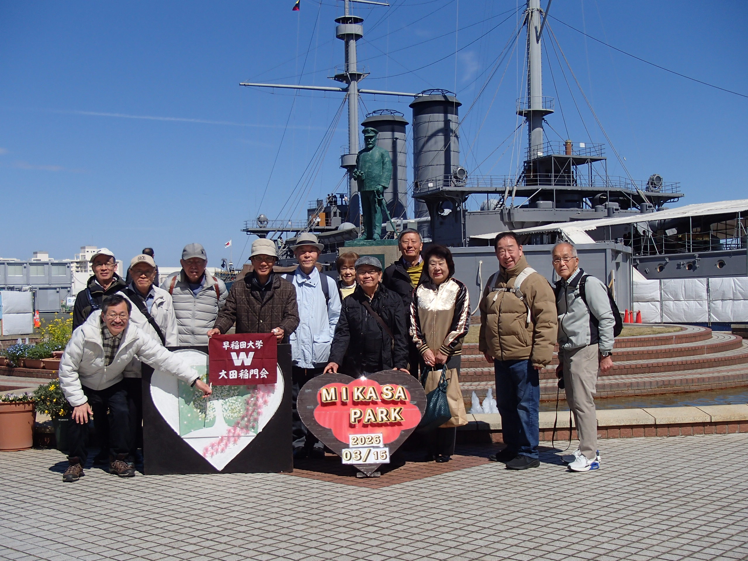 3月15日に横須賀の記念艦「三笠」を見学してきました。参加者は12名、まずは有名なドブ板通りで早めの腹拵えを…著名なお店で海軍カレーやネイビーバーガーをいただきました。さて私が食べたハンバーガーのデカいこと!カブりつくのに顎が痛くなりました。店を出たあと、お隣のジャンパー屋さんで背中にトラが吠えるド派手なスカジャンを買う人も…。ご贔屓の阪神タイガースの試合に着ていくそうです。
