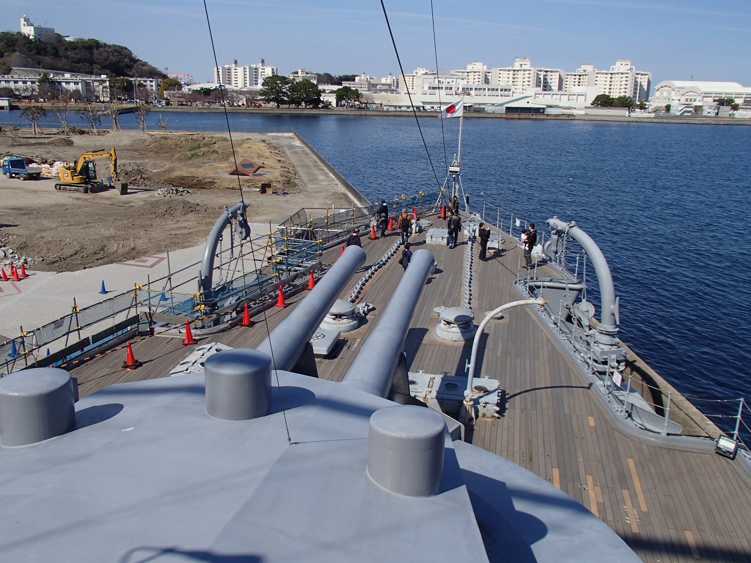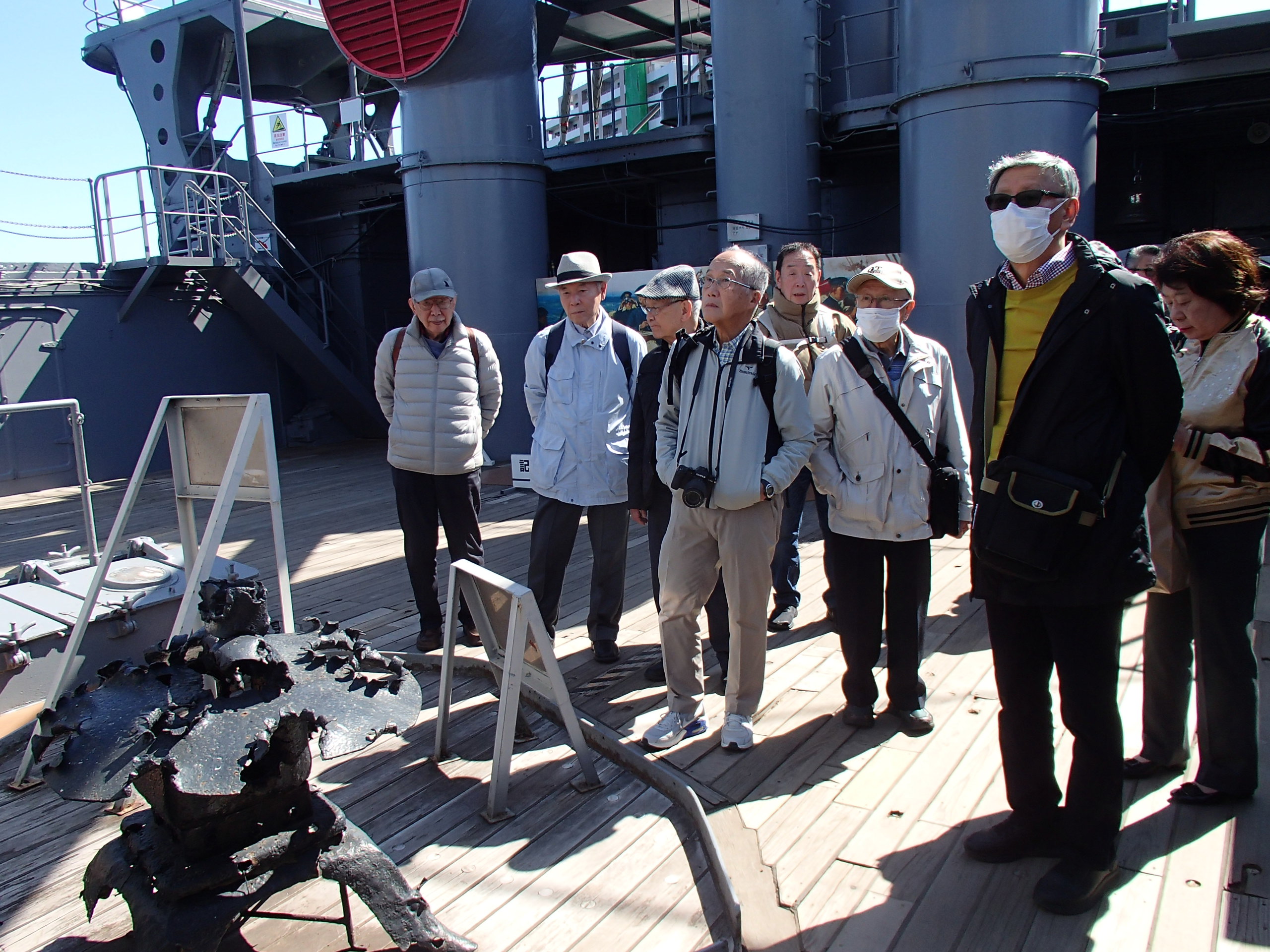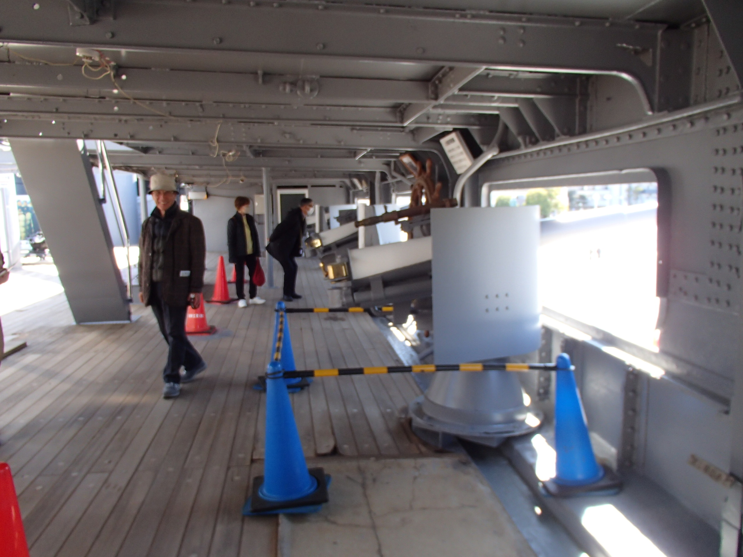 入艦後、来場者向けの解説ビデオを見てから艦内をまわります。甲板部の副砲(15cm)や補助砲(8cm)、艦内に入ると当時を再現した居室、当時の歴史史料の展示コーナー、日本海海戦の操艦を再現したシミュレーションコーナーなど見どころは多数ありますが、やはり一番人気は前部の30cm主砲の連装砲塔から艦橋にかけてのエリアでしょう。この主砲塔の横で、不肖薄根が日露戦争の「三笠」から太平洋戦争の「大和」に至る戦艦の主砲配置の変遷について一席弁じました。(自分で言うのもナンですが面白いテーマだと思っています)