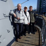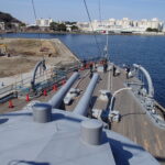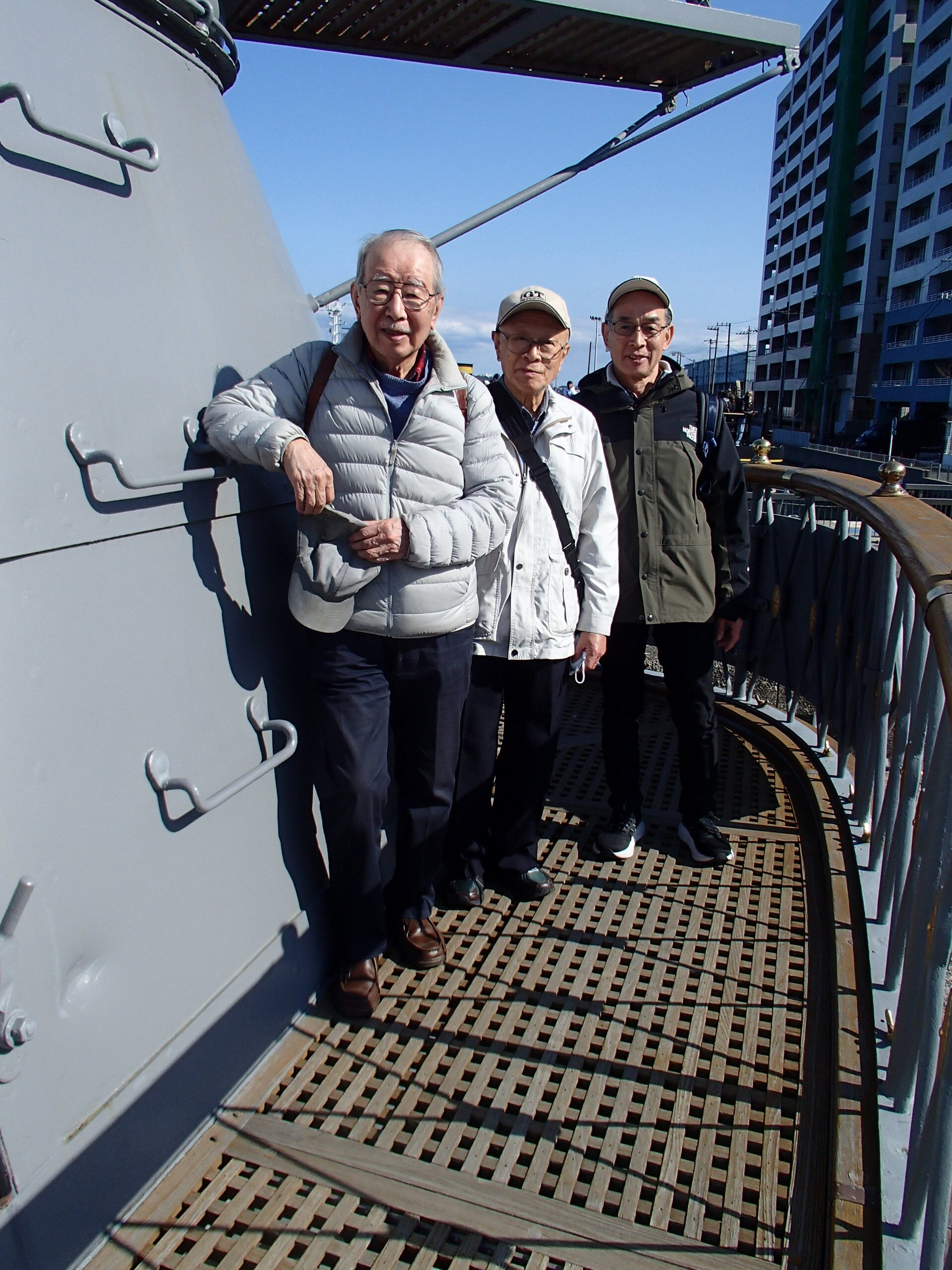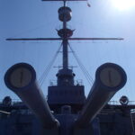 そして艦橋最上部に上がれば、そこは東郷平八郎司令長官や秋山真之参謀などが描かれた、あの有名な絵画の舞台です。私たちが訪れた横須賀の海は「本日天気晴朗にして波静か」。東郷司令長官、秋山参謀に加えて加藤参謀長、伊地知艦長の立ち位置には表示がありそこに立つことができます。ここから6kmほどの距離をおいて、ロシア艦隊との苛烈な砲撃戦の末に日本連合艦隊は圧勝します。明治38年5月27日から翌28日にかけてのことです。